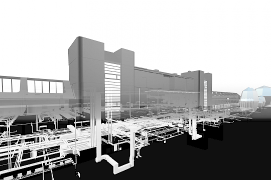 Unser Team hat bereits erhebliche Fortschritte in der Bearbeitung der Leistungsphase 5 erzielt und intensiv an den technischen Details gearbeitet. Ein zentraler Bestandteil unserer Planung ist der Einsatz von Building Information Modeling (BIM). Dank BIM können wir verschiedene Szenarien simulieren, Kollisionen frühzeitig erkennen und die Effizienz im Bauprozess steigern. Hier sehen Sie einen Ausschnitt aus unserer BIM-Darstellung, der die Planung der Hallen 14+15 veranschaulicht. ©BIMcollab