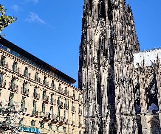Das Dom-Hotel erweckt beinahe den Eindruck, bereits in vollem Betrieb zu sein – wären da nicht noch das Baugerüst und der eingepackte Schriftzug, die auf den aktuellen Baufortschritt hinweisen. Zukünftig wird es nicht mehr "Dom-Hotel", sondern "DomHotel" heißen. Wunsch des Pächters (entgegen der Aussage aus der Presse, dass das Baudenkmal dies wollte). Und die Eröffnung des Dom-Hotels verschiebt sich erneut, ins Jahr 2026. Der Grund dafür: der extrem komplizierte Bau - stay tuned! ©Julia Köstner